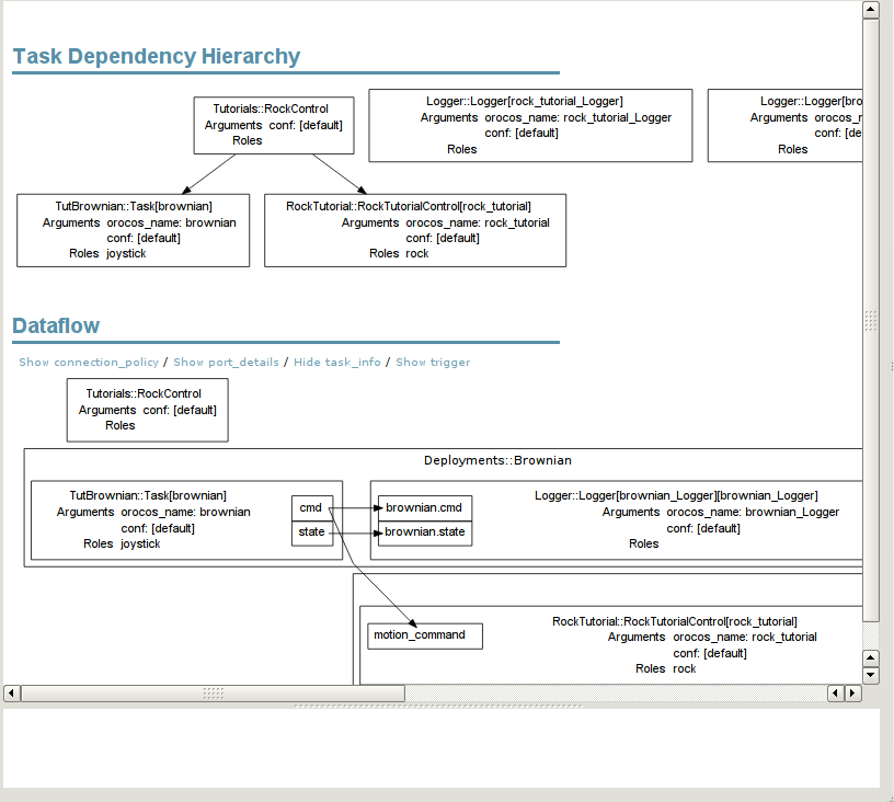 First and foremost, when multiple oroGen projects start to be involved, deployments quickly become hard to manage. The accepted workflow when you are starting to build a complete system is to create a dedicated “deployment project” that creates all the deployments that your system needs. In the case of these tutorials, it is the tutorials/orogen/tut_deployment oroGen project. Have a look at it, and make sure that it is built in your installation by either adding manually to autoproj/manifest or by building the whole rock.tutorials package set once and for all